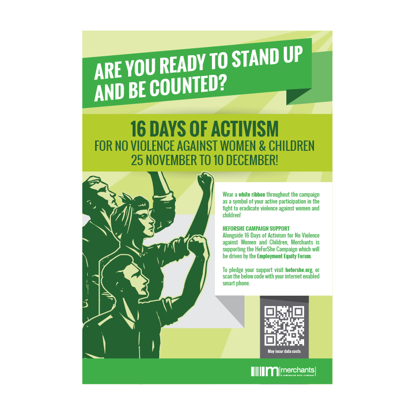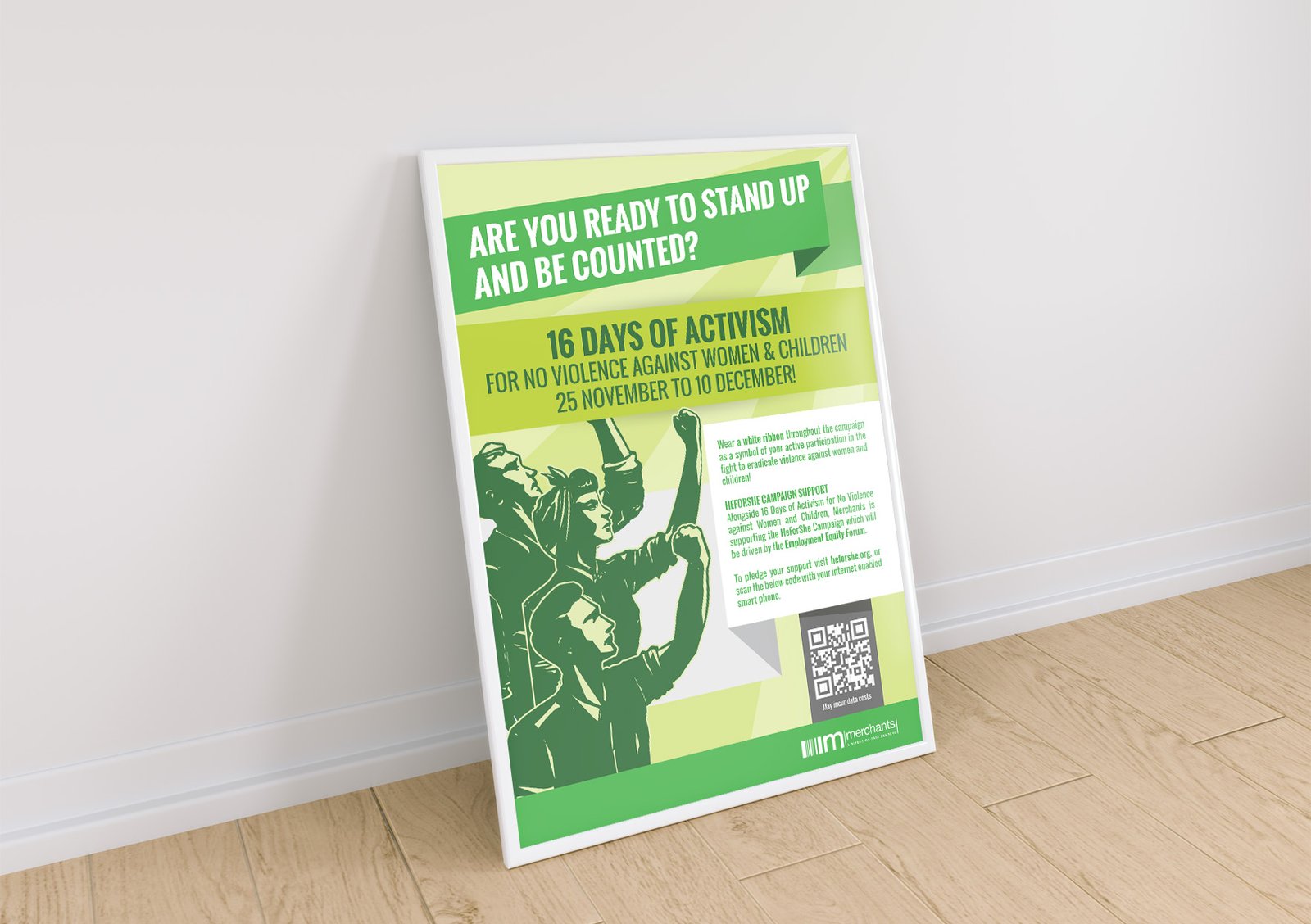 A poster for a corporate 16 days of activism campaign to be printed and put up in various business units.