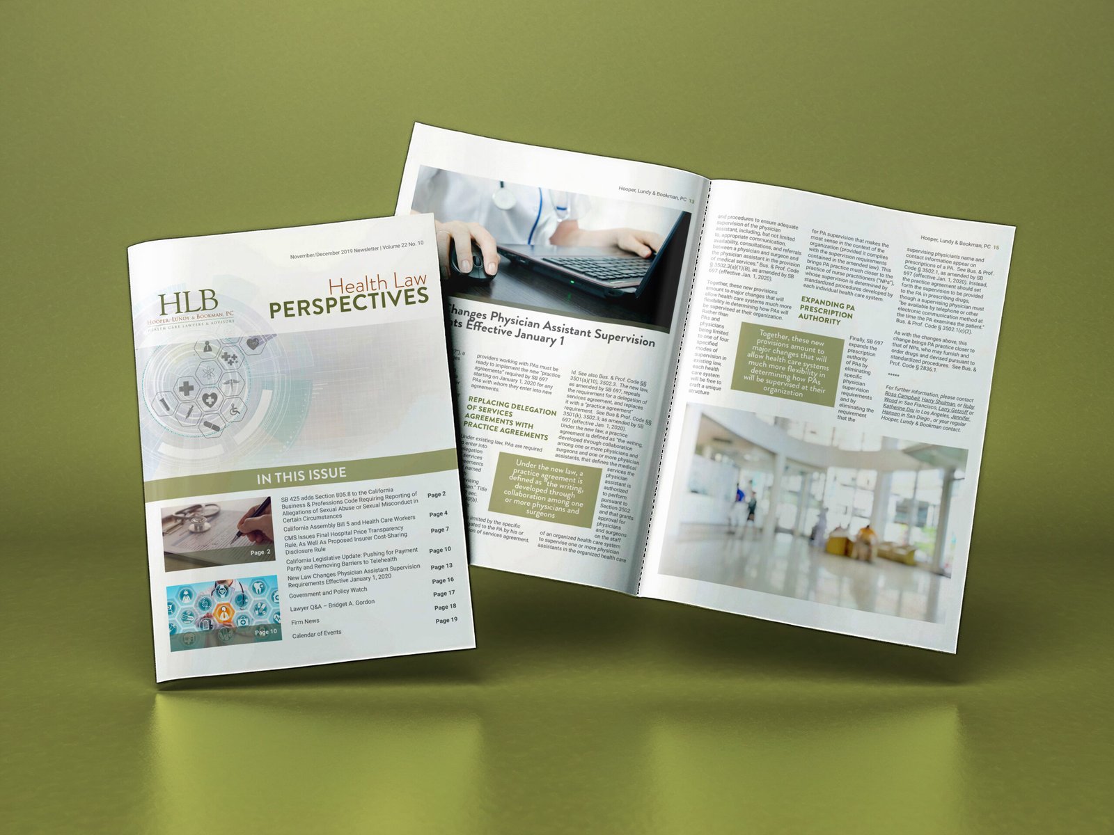 A monthly newsletter for a medical law firm. This newsletter was sent out as a digital and print version to the firm’s clients to inform them about medical law news.